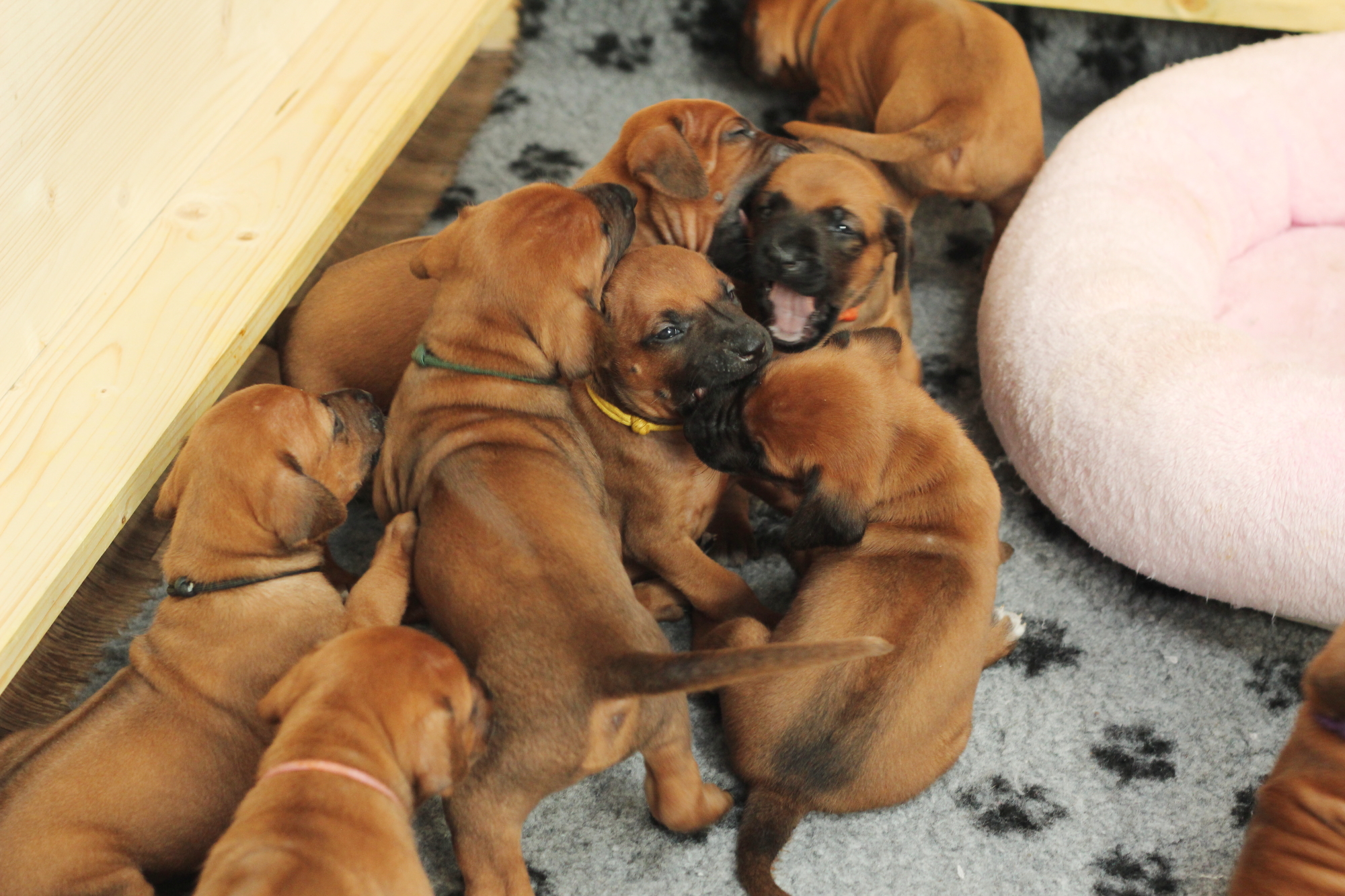 Štěňátkům byly 4 týdny. Z malých válečků se stávají pěkní dravci s ostrými zoubky a drápky. O sourozenecké pošťuchování není nouze. Zároveň jsou to velcí mazlové, kteří si rádi vlezou na klín 🙂 Přivítali jsme i první návštěvy.