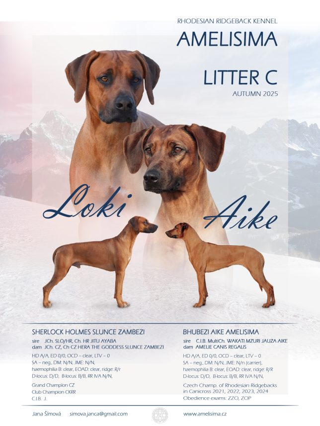 Tatínek štěňátek je mladý pes s vyrovnanou a přátelskou povahou, který je úspěšný na výstavách. Žije společně s desetiletým ridgebackem Kevinem. Na informace o Lokiho rodokmenu se můžete podívat zde, aktuální informace a fotky jsou na facebookových stránkách.